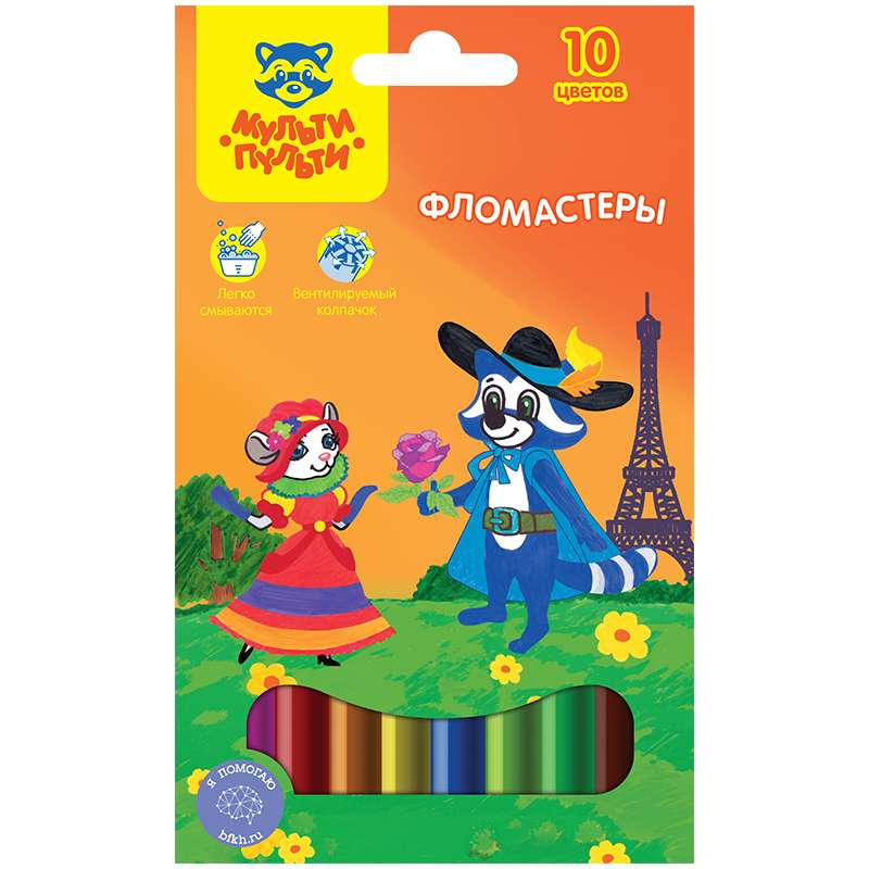 Легкосмываемые чернила, вентилируемый колпачок, нетоксичны, корпус изготовлен из полипропилена. Упакованы в картонную лакированную коробку с петлей-европодвесом. Длина линии не менее 500 м.Фломастеры Мульти-Пульти "Енот во Франции", 10цв, смываемые, картон, европодвес
