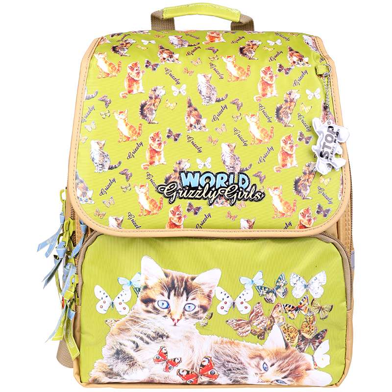 Ранец школьный, два отделения, клапан на липучках, два объемных кармана на молнии на передней стенке, внутренний составной пенал-органайзер, жесткая анатомическая спинка, дополнительная ручка-петля, укрепленные лямки, брелок-игрушка, светоотражающие элементы с четырех сторонРанец Grizzly, 29*35*19см, 2 отделения, 2 кармана, анатомическая спинка