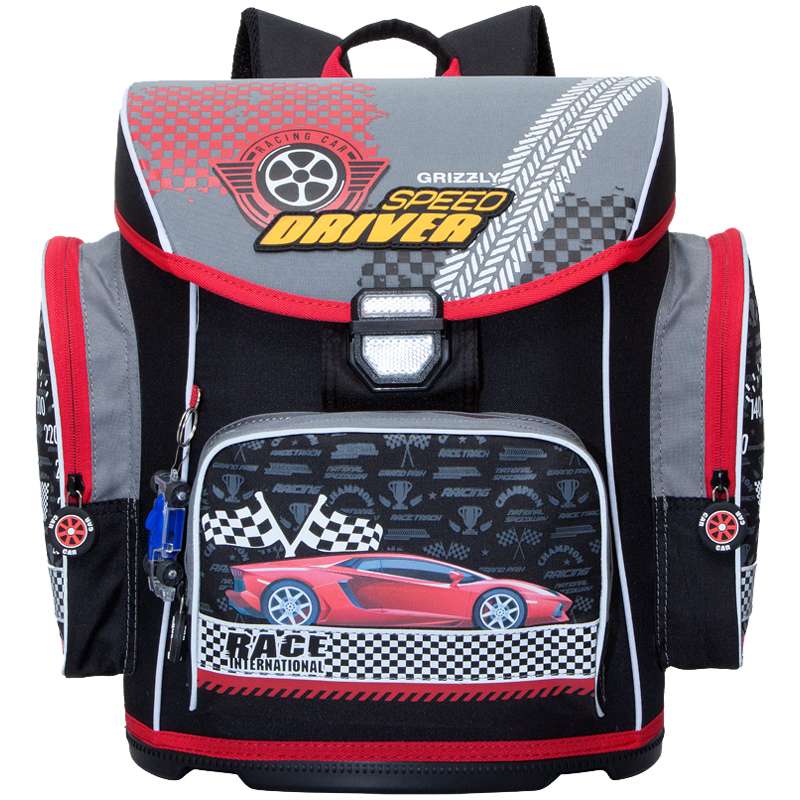 Ранец школьный, одно отделение, пластмассовое формованное дно, твердый клапан, объемный карман на молнии на передней стенке, объемные боковые карманы на молнии, внутренний подвесной карман на молнии, разделительная перегородка-органайзер, жесткая анатомическая спинка, дополнительная ручка-петля, укрепленные лямки с возможностью регулировки размера под рост, брелок-игрушка, светоотражающие элементы с четырех сторонРанец Grizzly, 34*38*19см, 1 отделение, 3 кармана, анатомическая спинка