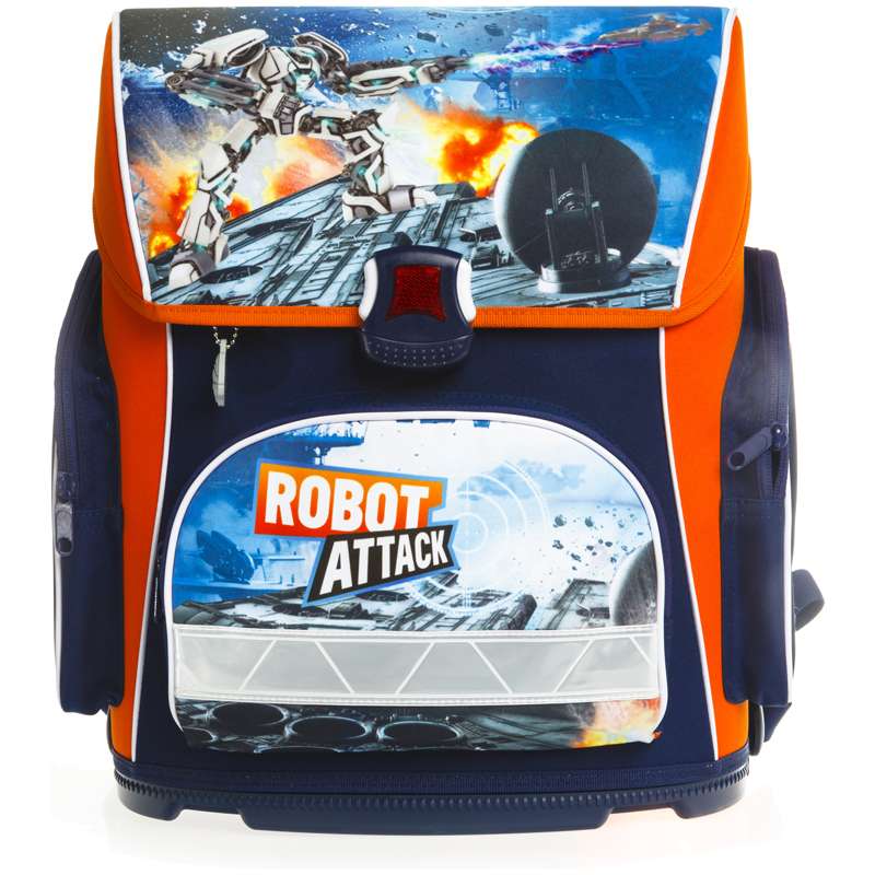 Ранец серии «Optimum» для младшего школьного возраста. Жесткий анатомический каркас и форма спинки способствуют равномерному распределению нагрузки и формированию правильной осанки. Ткань имеет водоотталкивающую пропитку, устойчивость к истиранию и выцветанию под воздействием УФ излучения. Светоотражающие элементы на передней, боковой и задней частях ранца обеспечивают безопасность ребенка на дороге. Преимуществом ранца является малый вес, большая вместимость и удобная организация внутреннего пространства.Ранец Hatber Optimum "Robot attack" 37*30*17см, 1 отделение, 3 кармана, анатомическая спинка