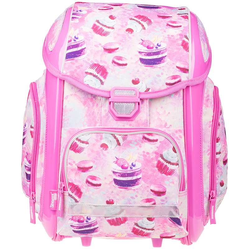 Ранец с эргономической спинкой из водонепроницаемого материала. Одно основное отделение, закрывается крышкой-клапаном на замке, внутри - разделитель на резинке. На передней панели имеется карман на молнии и два дополнительных кармана по бокам ранца. Лямки анатомической S-обазной формы, свободно регулируются по длине.Ранец с наполнением Seventeen Kids "Кексы" 38*30*19см, 1 отделение, 3 кармана, эргономичная спинка