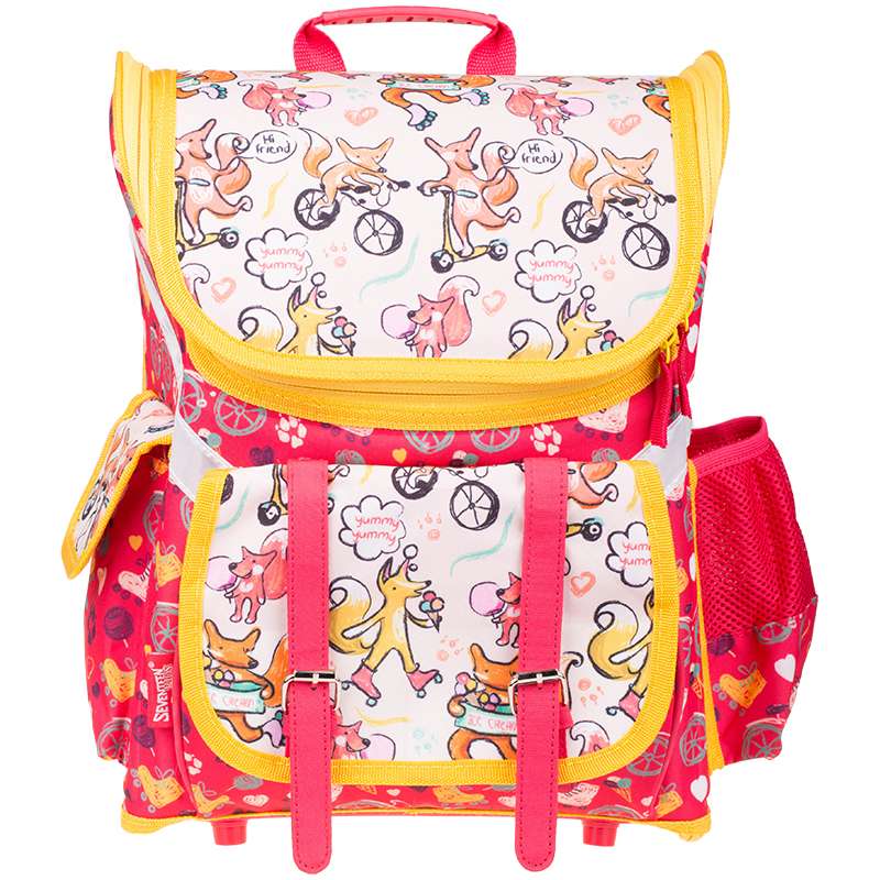 Ранец-трансформер профилактический с EVA-спинкой из водонепроницаемого материала. Ранец имеет основное отделение на молнии с двумя разделителями, которые фиксируются резинкой, чтобы избежать движения предметов. На фронтальной части располагается карман на молнии. С одной из боковых сторон карман-сетка, с другой закрытый карман на липучке. Благодаря прорезиненной ручке, ранец удобно носить в руке. Лямки выполнены с использованием поролона и воздухообменного сетчатого материала, регулируются по длине, имеют анатомическую S-образную форму. Дно ранца имеет пластиковые ножки. Светоотражающие элементы спереди, по бокам и на лямках.Ранец с наполнением Seventeen Kids "Лисы" 36*26*17см, 1 отделение, 3 кармана, эргономичная спинка