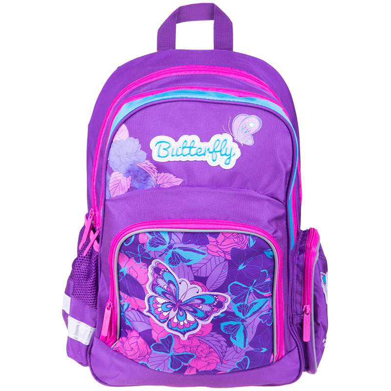 Серия Light - это лёгкие яркие рюкзаки для детей младшего школьного возраста. Рюкзак имеет 2 отделения, большой передний карман на молнии и 2 боковых кармана. Рюкзаки данной серии изготовлены из прочного нейлона, характеризующегося повышенной износостойкостью и в тоже время мягкостью. Эргономичная спинка и широкие лямки делают рюкзак максимально удобным. Светоотражающие элементы на лямках, передней части рюкзака и боковых карманах гарантируют безопасность ребёнка в тёмное время суток.Рюкзак Berlingo Light "Butterfly" 42*28*17см, 2 отделения, 3 кармана, эргономичная спинка