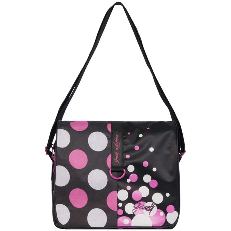 Молодежная сумка, два отделения, клапан на липучках, два передних кармана, объемный передний карман на молнии, плоский передний карман на молнии, внутренний карман на молнии, регулируемый плечевой ременьСумка Grizzly 33,5*28*10см, 2 отделения, черно-розовый, большие горохи