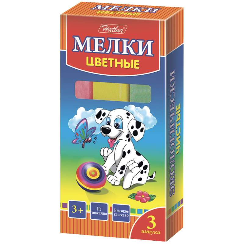 Набор цветных мелков. Упаковка - картонная коробочка, 3 брусочка различных цветов. Мелки предназначены для рисования на любой шероховатой поверхности. Изготовлены из экологически чистых продуктов .Набор цветного мела Hatber "Далматинцы", 3цв