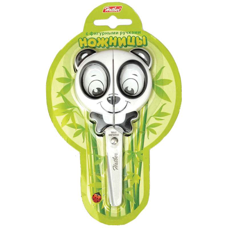 Ножницы школьные с усилителем. Предназначены для работы с бумагой и неплотным картоном. Материал лезвий - нержавеющая сталь. Ручки выполнены из пластика с рисунком.Ножницы детские Hatber "Панда" 13см, европодвес