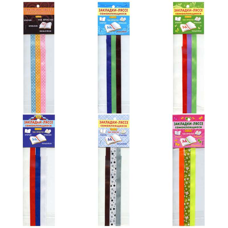 Закладки-ляссе представляют собой 3 широкие (шириной 10-13 мм) ленты из ткани разных расцветок формата А4. На конце ленты имеется липкий слой, благодаря которому на заднюю часть обложки с внутренней стороны наклеивается закладка. Упакованы в пакет с европодвесом.Закладка - ляссе самоклеящаяся для формата А4, Миленд (3 широкие ленты)