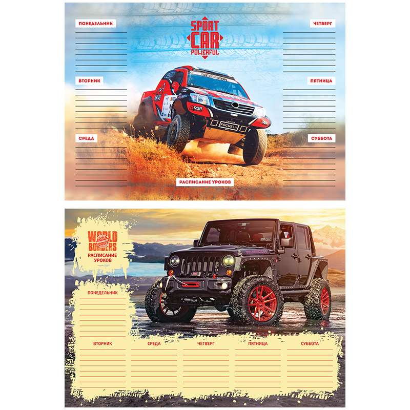 Расписание уроков формата А3 сделано на плотном целлюлозном импортном картоне плотностью 200 г/м2. В одном артикуле представлено 2 дизайна с тематикой "Джипы". Расписания упакованы в термоусадочную пленку по 20 шт. (по 10шт каждого из 2-ух дизайнов). Транспортная упаковка - гофрокороб.Расписание уроков А3 "Джипы"