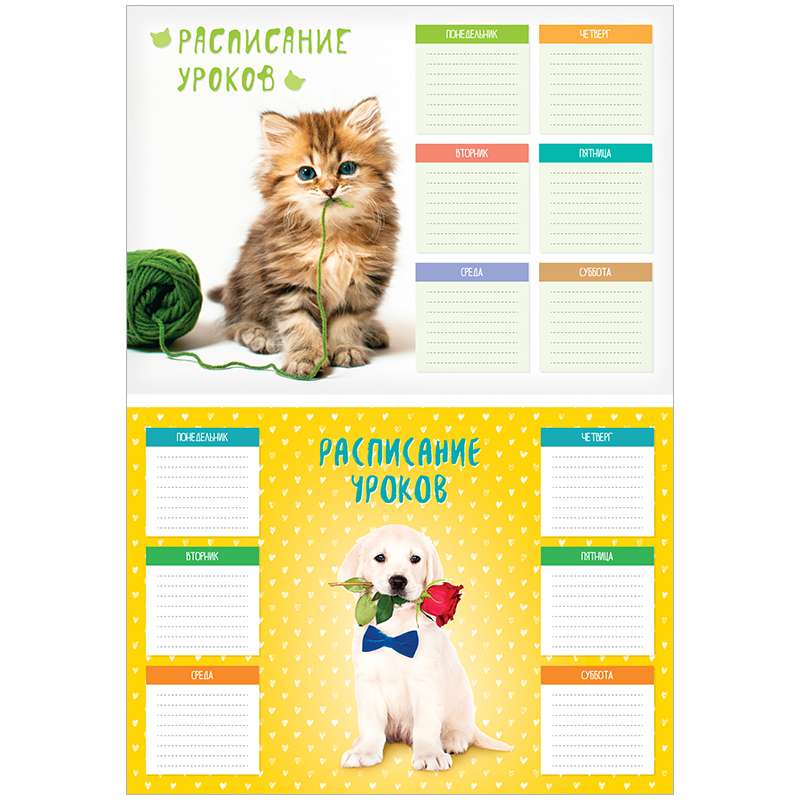 Расписание уроков формата А3 сделано на плотном целлюлозном импортном картоне плотностью 200 г/м2. В одном артикуле представлено 2 дизайна с тематикой "Питомцы". Расписания упакованы в термоусадочную пленку по 20 шт. (по 10шт каждого из 2-ух дизайнов). Транспортная упаковка - гофрокороб.Расписание уроков А3 "Питомцы", выборочный уф-лак