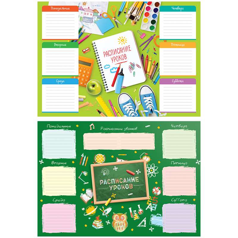 Расписание уроков формата А3 сделано на плотном целлюлозном импортном картоне плотностью 200 г/м2. В одном артикуле представлено 2 дизайна с тематикой "Школа". Расписания упакованы в термоусадочную пленку по 20 шт. (по 10шт каждого из 2-ух дизайнов). Транспортная упаковка - гофрокороб.Расписание уроков А3 "Школа", выборочный уф-лак