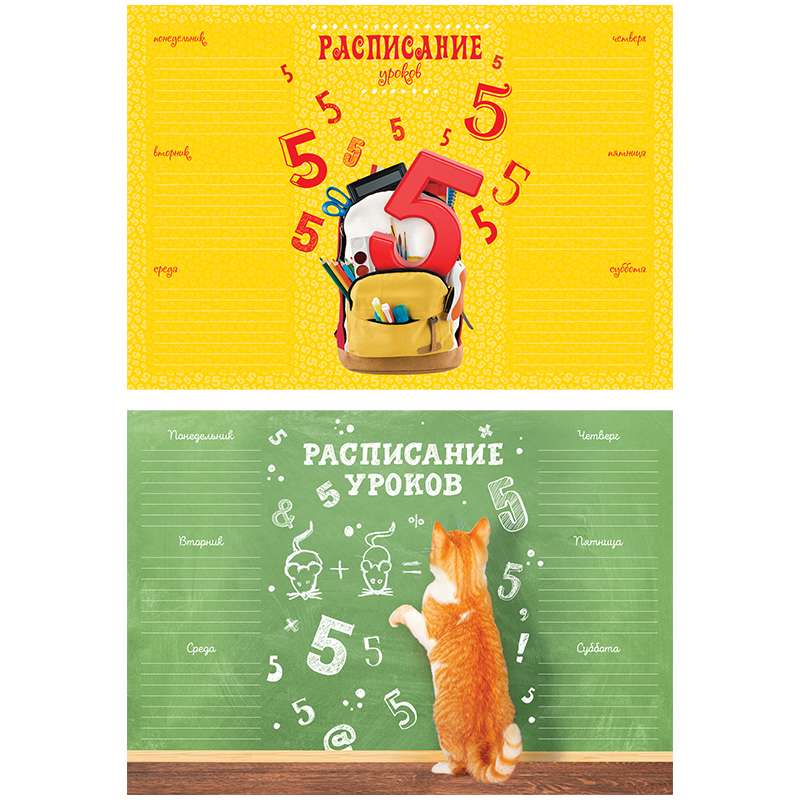 Расписание уроков формата А4 сделано на плотном целлюлозном импортном картоне плотностью 200 г/м2. В одном артикуле представлено 2 дизайна с тематикой "Школа". Расписания упакованы в термоусадочную пленку по 20 шт. (по 10шт каждого из 2-ух дизайнов). Транспортная упаковка - гофрокороб.Расписание уроков А4 "Для отличной учебы"