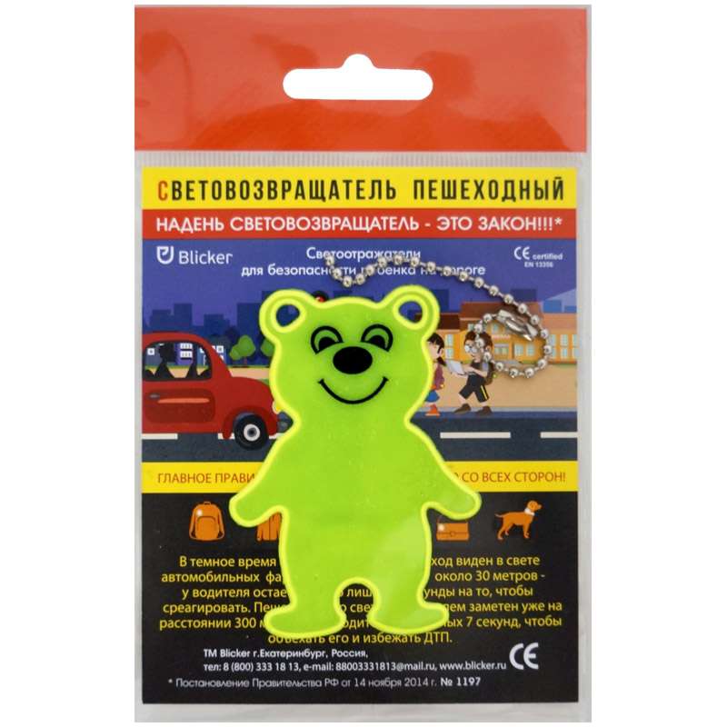 Во избежание аварийных ситуаций на дороге, крепите светоовозвращатели с обеих сторон, спереди и сзади. В комплект со светоотражателем входит специальное крепление - шариковая цепочка. В темное время суток движущийся пешеход становится виден в свете автомобильных фар только на расстоянии 30 метров - у водителя остается всего лишь 1,3 секунды на то, чтобы среагировать. Пешеход же со светоотражателем заметен уже на расстоянии 300 метров, и у водителя есть целых 7 секунд, чтобы объехать его и избежать ДТП. Специалисты считают, что в темноте риск для пешехода стать жертвой ДТП или спровоцировать аварию возрастает в два раза, притом у пешехода без светоотражателя он почти в десять раз выше, чем у того, кто использует это полезное изобретение. С 2015 года ношение световозвращателей стало обязательным на основании постановления правительства № 1197 от 14.11.2014 г.Световозвращающая подвеска Blicker "Мишка ", салатовый