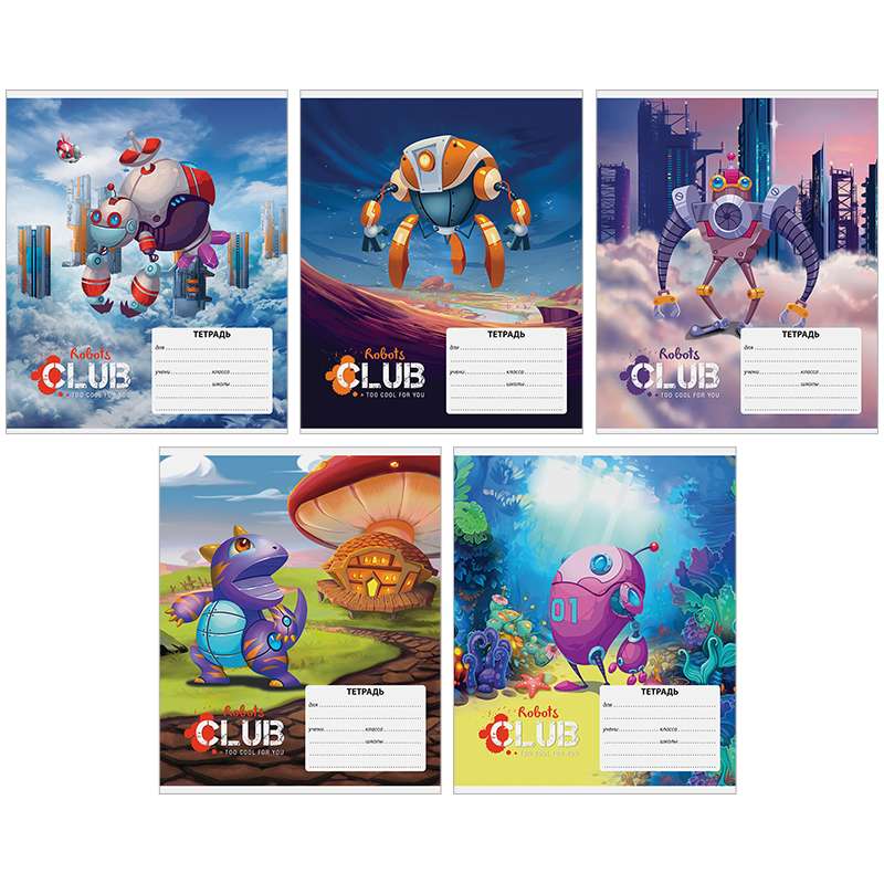 Внутренний блок – офсет 60 г/м² в клетку с полями. Обложка – мелованный картон, ВД-лак. Объем блока – 18 л. Формат А5.Тетрадь 18л. клетка "Мультяшки. Robots club"