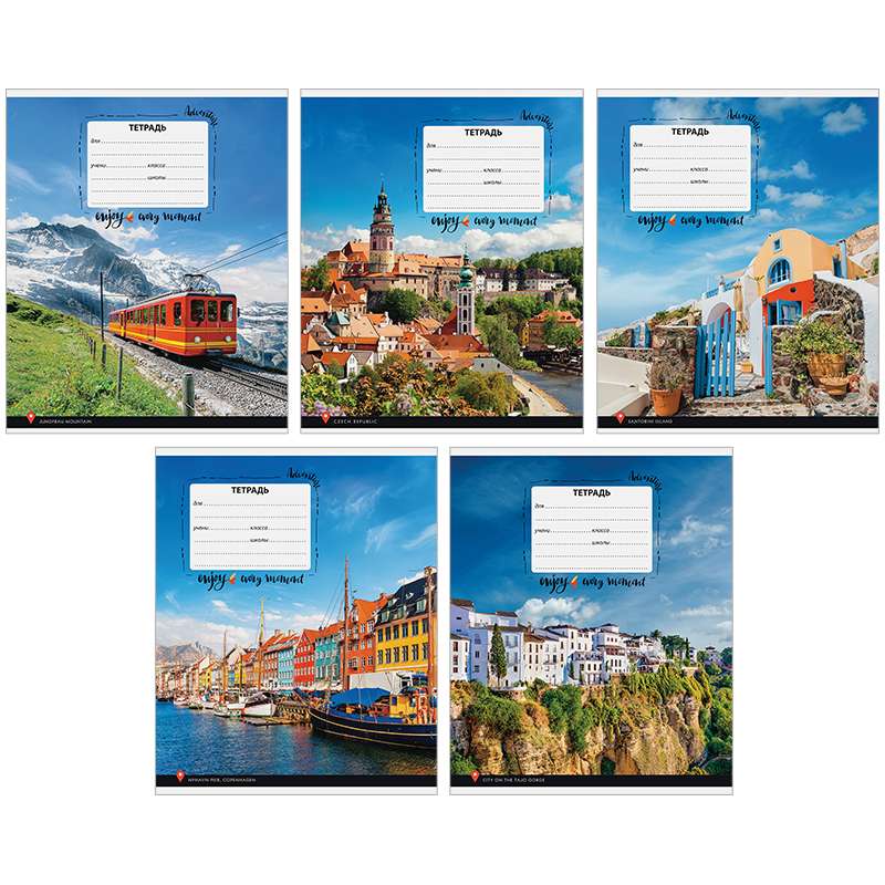 Внутренний блок – офсет 60 г/м² в клетку с полями. Обложка – мелованный картон, ВД-лак. Объем блока – 18 л. Формат А5.Тетрадь 18л. клетка "Путешествия. Enjoy of adventures"