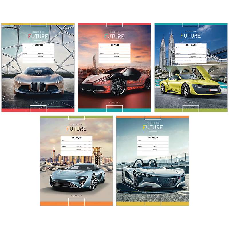 Внутренний блок – офсет 60 г/м² в линию с полями. Обложка – мелованный картон, ВД-лак. Объем блока – 18 л. Формат А5.Тетрадь 18л. линия "Авто. Forward to the future"