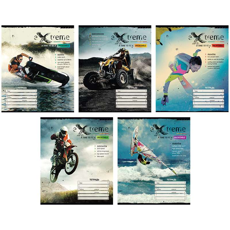Внутренний блок – офсет 60 г/м². Обложка – мелованный картон, ВД-лак. Объем блока – 18 л. Формат А5Тетрадь 18л. линия "Спорт. Extreme. Incredible"