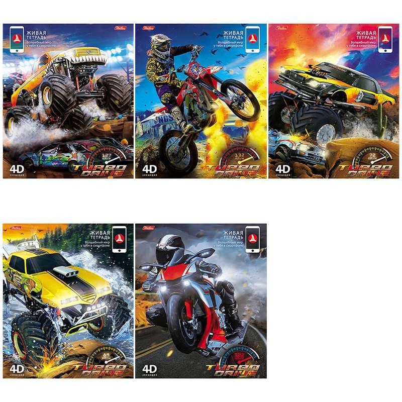 Формат А5. Вид крепления -скрепка. Обложка -мелованный картон. Внутренний блок -офсетный, 60 г/м2, клеткаТетрадь 48л., А5, клетка Hatber "4DTurboDrive"
