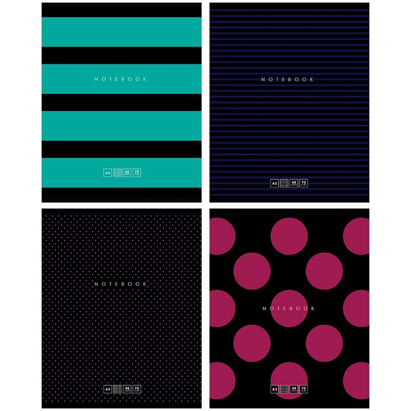 Тетрадь общая 48 л. на скобе, формата А5 (165*205 мм). Внутренний блок – офсетная бумага повышенной плотности 70 г/м², белизна 100%, клетка. Обложка изготовлена из импортоного целлюлозного мелованного картона с двусторонней запечаткой, отделка обложки – матовая ламинация, выборочное глянцевое УФ-лакированиеТетрадь 48л. А5 клетка "In black", матовая ламинация, выборочный уф-лак, 70 г/м2