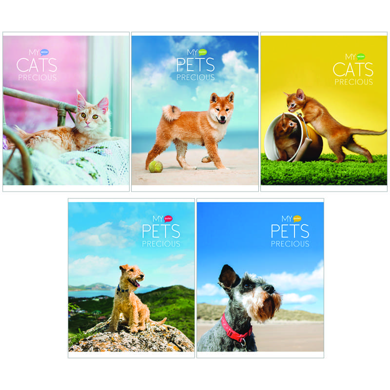 Тетрадь общая формата А5 (165*205 мм) на скобе, 48 листов. Внутренний блок – офсет 60 г/м², белизна 100%, клетка с полями. Обложка изготовлена из импортного целлюлозного мелованного картона, отделка обложки – водный лак.Тетрадь 48л. А5 клетка "Животные. My pets"