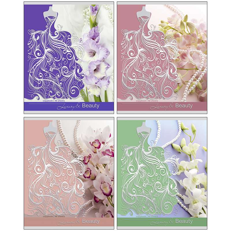 Формат А5. Вид крепления - скрепка. Обложка - мелованный картон с тиснением фольгой. Внутренний блок - офсетный, 60 гр/м2, клеткаТетрадь 48л. А5 клетка "Luxury&beauty", тиснение фольгой