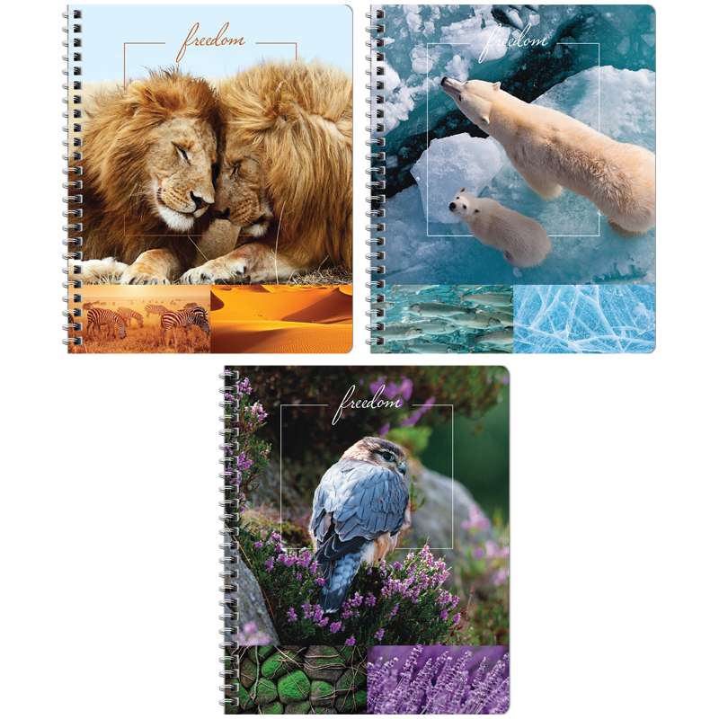 Тетрадь общая 48 л. на гребне, формата А5 (165*205 мм). Внутренний блок – офсет 60 г/м², белизна 100%, клетка. Обложка изготовлена из импортного целлюлозного мелованного картона, отделка обложки – глянцевый УФ-лак.Тетрадь 48л. А5 клетка на гребне "Природа. Freedom", глянцевый уф-лак