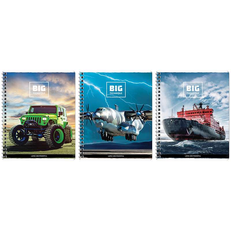 Тетрадь общая 48 л. на гребне, формата А5 (165*205 мм). Внутренний блок – офсет 60 г/м², белизна 100%, клетка. Обложка изготовлена из импортного целлюлозного мелованного картона, отделка обложки – ВД-лак.Тетрадь 48л. А5 клетка на гребне "Техника. Большие и мощные"