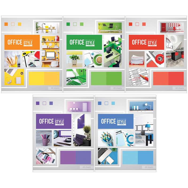 Тетрадь общая формата А5 (165*205 мм) на скобе, 48 листов. Внутренний блок – офсет 60 г/м², белизна 100%, клетка с полями. Обложка изготовлена из импортного целлюлозного мелованного картона, отделка обложки – водный лак.Тетрадь 48л. А5 клетка "Офис. Яркие краски"