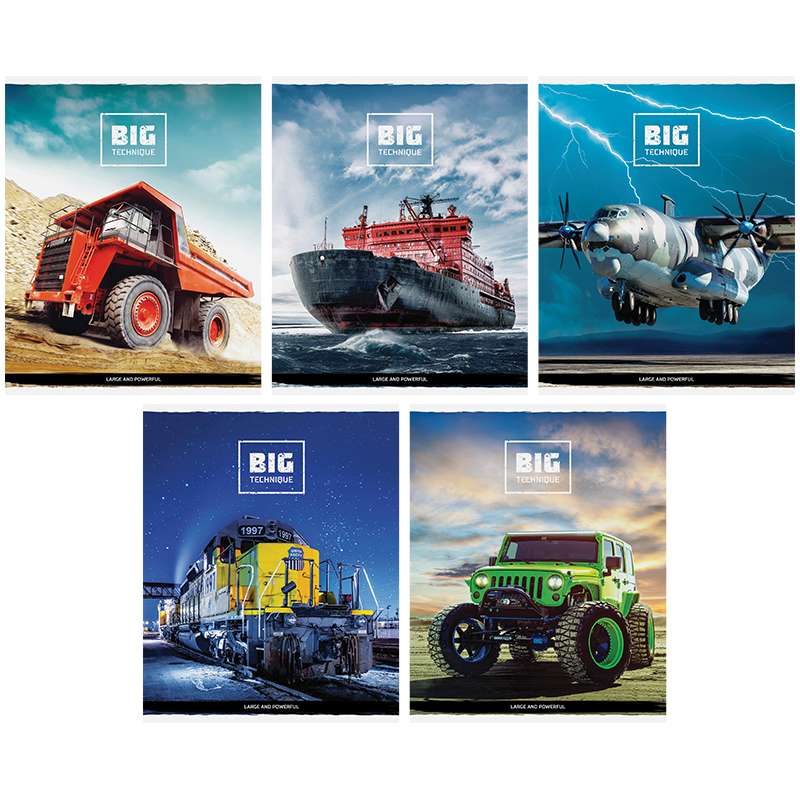 Тетрадь общая 48 л. на скобе, формата А5 (165*205 мм). Внутренний блок – офсет 60 г/м², белизна 100%, клетка. Обложка изготовлена из импортного целлюлозного мелованного картона, отделка обложки – ВД-лак.Тетрадь 48л. А5 клетка "Техника. Большие и мощные"