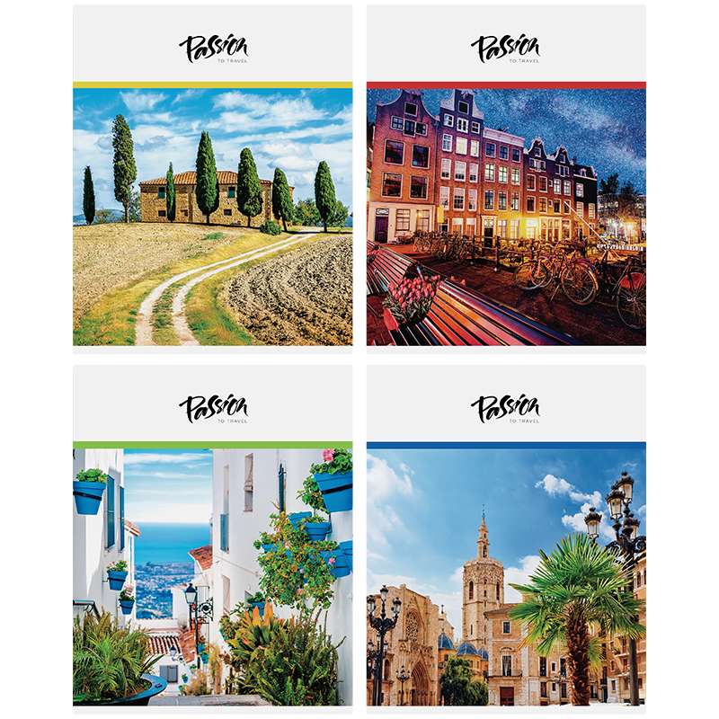 Тетрадь общая 48 л. на скобе, формата А5 (165*205 мм). Внутренний блок – офсетная бумага повышенной плотности 70 г/м², белизна 100%, линия. Обложка изготовлена из импортоного целлюлозного мелованного картона с двусторонней запечаткой, отделка обложки – глянцевая ламинацияТетрадь 48л. А5 линия "Passion to travel", глянцевая ламинация, 70 г/м2