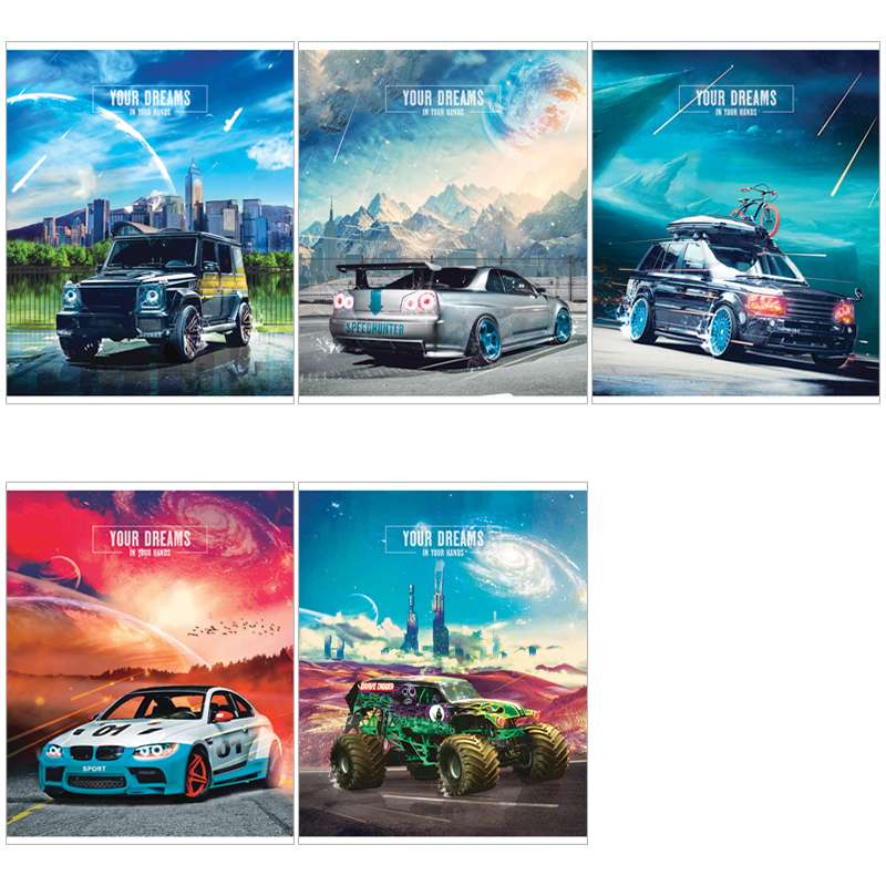 Тетрадь общая формата А5 (165*205 мм) на скобе, 80 листов. Внутренний блок – офсет 60 г/м², белизна 100%, клетка с полями. Обложка изготовлена из импортного целлюлозного мелованного картона, отделка обложки – водный лак.Тетрадь 80л. А5 клетка "Авто. Your dreams"