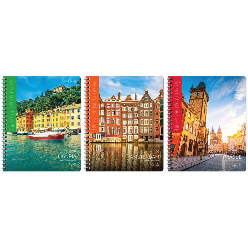 Тетрадь общая 80 л. на гребне, формата А5 (165*205 мм). Внутренний блок – офсет 60 г/м², белизна 100%, клетка. Обложка изготовлена из импортного целлюлозного мелованного картона, отделка обложки – ТВИН-лак.Тетрадь 80л. А5 клетка на гребне "Путешествия. Европейские города", ТВИН-лак