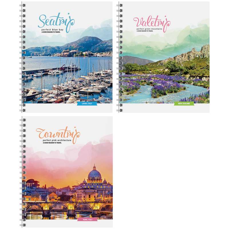 Внутренний блок – офсет 60 г/м². Обложка – мелованный картон, глянцевый УФ-лак. Объем блока – 80 л. Формат А5.Тетрадь 80л. А5 клетка на гребне "Путешествия. Romantic places", глянцевый УФ-лак