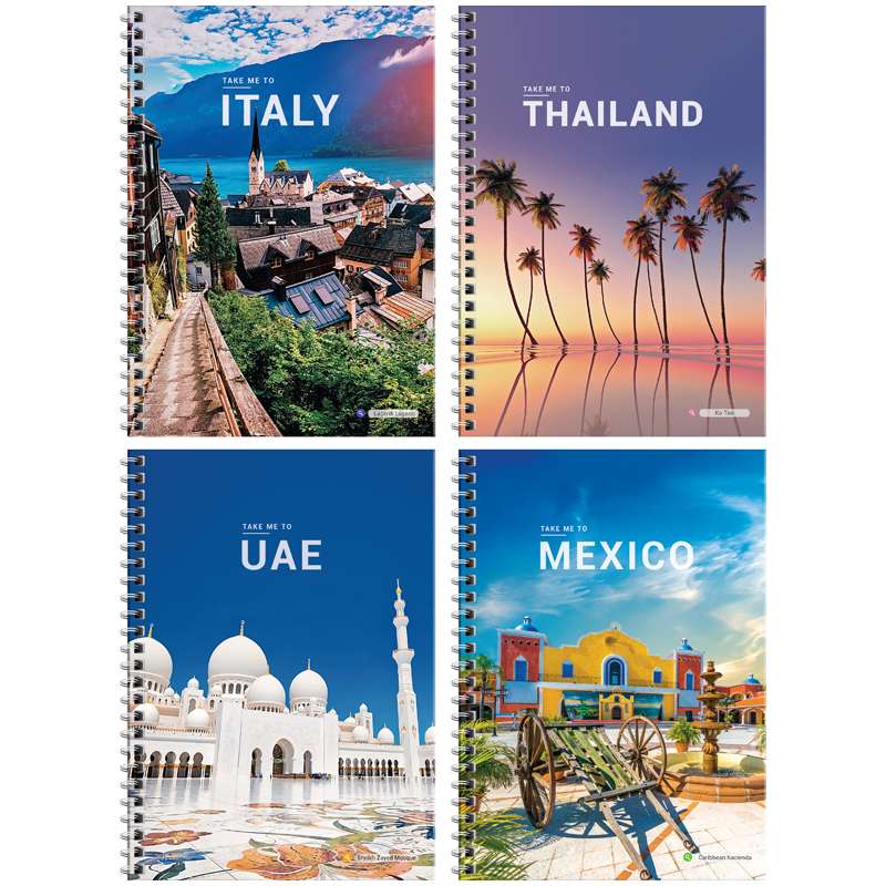 Тетрадь для записей формата А5, 96 листов, в твердой обложке с глянцевой ламинацией. Внутренний блок - белая офсетная бумага плотностью 60 г/кв.м, в клетку без полей.Тетрадь 96л., А5, клетка на гребне ArtSpace "Путешествия. Take me to travel", глянц. лам., тв. обл.