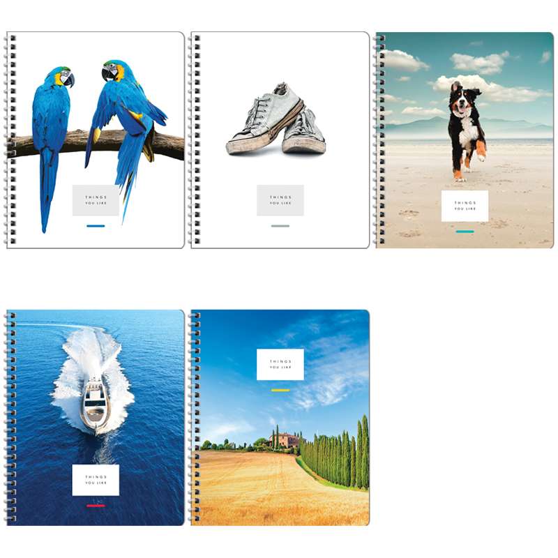 Тетрадь общая формата А5 (165*205 мм) на гребне, 96 листов. Внутренний блок – офсет 60 г/м², белизна 100%, клетка без полей. Обложка изготовлена из импортного целлюлозного мелованного картона, отделка обложки – водный лак.Тетрадь 96л. А5 клетка на гребне "Стиль. Things you like"