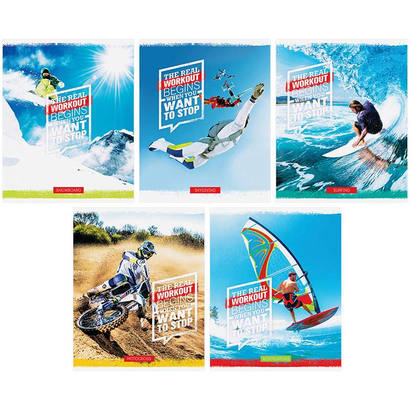 Тетрадь общая 96 л. на скобе, формата А5 (165*205 мм). Внутренний блок – офсет 60 г/м², белизна 100%, клетка. Обложка изготовлена из импортного целлюлозного мелованного картона, отделка обложки – глянцевый УФ-лак.Тетрадь 96л. А5 клетка "Спорт. Real workout", глянцевый уф-лак
