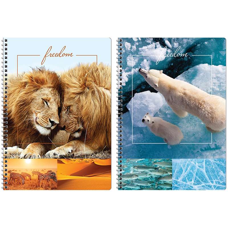 Тетрадь общая 96 л. на гребне, формата А4 (210*296 мм). Внутренний блок – офсет 60 г/м², белизна 100%, клетка. Обложка изготовлена из импортного целлюлозного мелованного картона, отделка обложки – глянцевый УФ-лак.Тетрадь 96л. А4 клетка на гребне "Природа. Freedom", глянцевый уф-лак