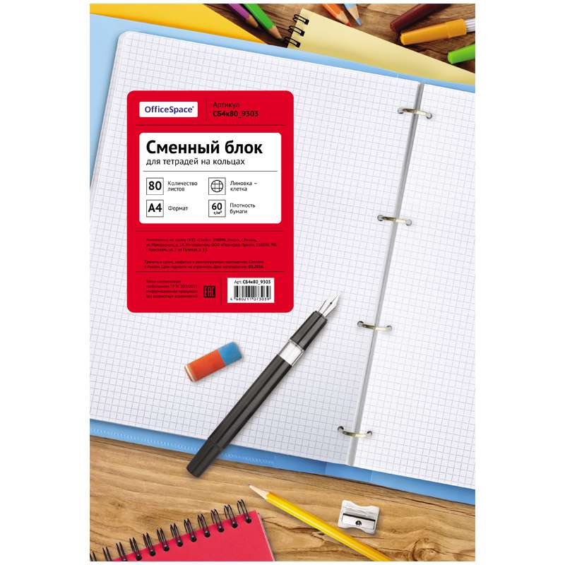 Сменный блок для тетрадей с кольцевыми механизмами. Формат А4, 80 листов. Белая офсетная бумага плотность 60 г/м² в клетку, без полей. Упакован в термоусадочную пленку с полноцветной картонной этикеткой.Сменный блок 80л. А4, белый