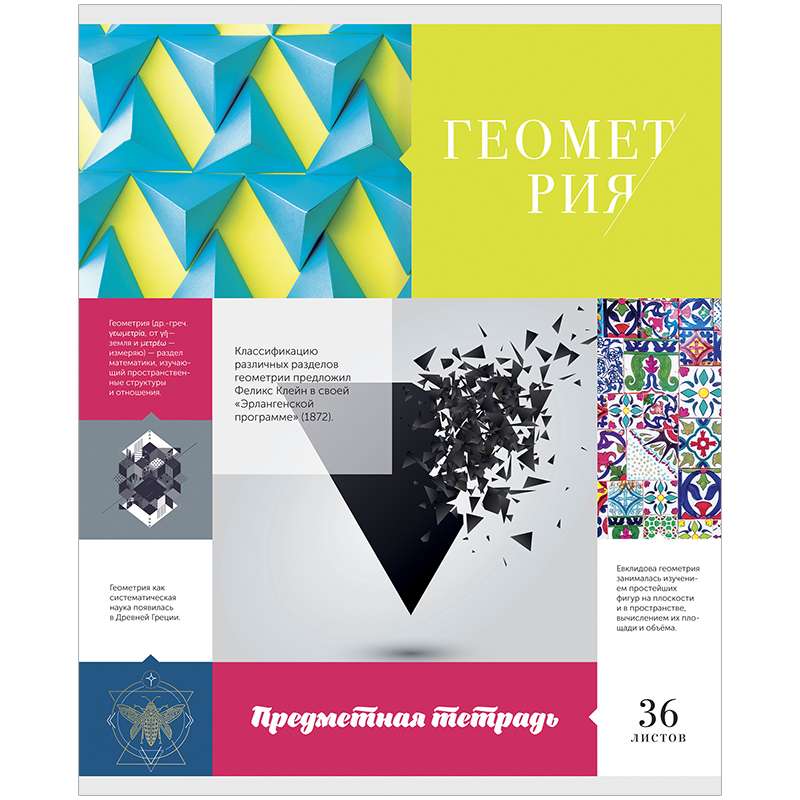 Тетрадь тематическая по геометрии из серии «Предметная мозаика» (в серии 14 предметов). Формат А5. Вид крепления – скрепка. Внутренний блок – 36 листов, офсет 60 г/м², белизна 100%, линовка – клетка с полями. Обложка – мелованный картон, отделка обложки – ВД-лак.Тетрадь тематическая 36л. "Предметная мозаика" - Геометрия