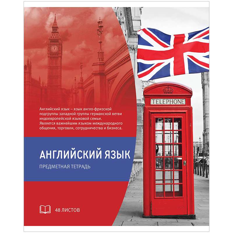 Тетрадь тематическая по английскому языку из серии «Глянец» (в серии 14 предметов), со справочным материалом на отдельных листах. Формат А5. Вид крепления – скрепка. Внутренний блок – 48 листов, офсет 60 г/м², белизна 100%, линовка – клетка с полями. Обложка – мелованный картон, отделка обложки – глянцевый УФ-лак.Тетрадь тематическая 48л. "Глянец" - Английский язык, глянцевый уф-лак