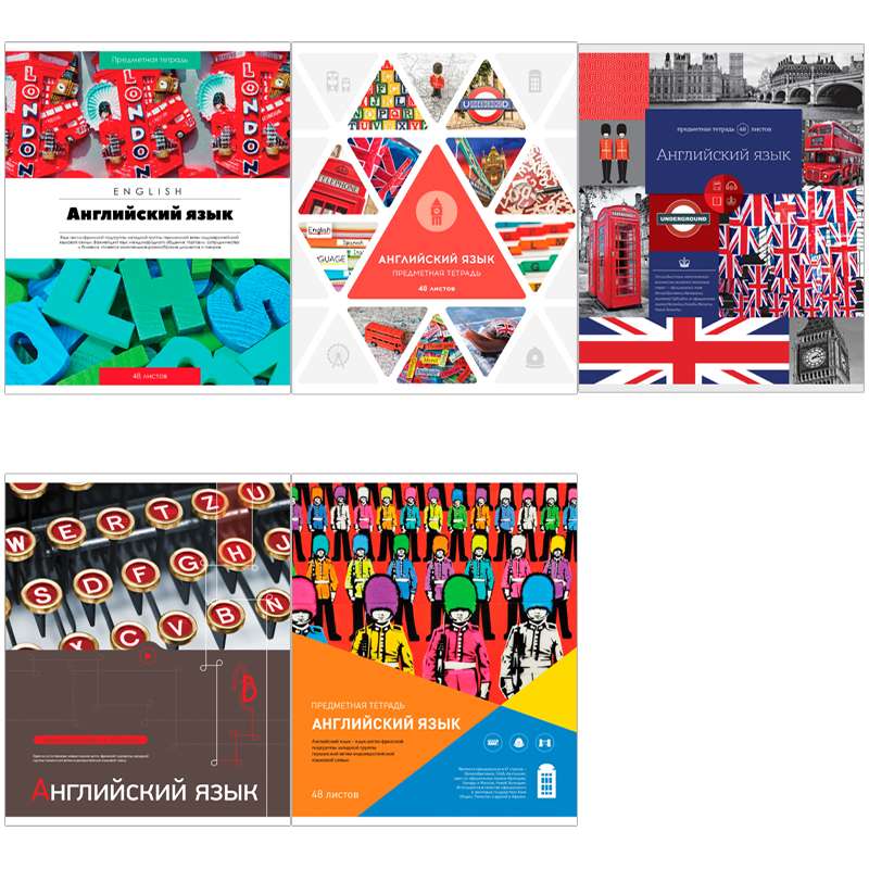Тетрадь тематическая по английскому языку из серии «Микс 5 в 1» (в серии 14 предметов), со справочным материалом на отдельных листах. Формат А5. Вид крепления – скрепка. Внутренний блок – 48 листов, офсет 60 г/м², белизна 100%, линовка – клетка с полями. Обложка – мелованный картон, отделка обложки – ВД-лак. 5 различных дизайнов по каждому предмету.Тетрадь тематическая 48л. "Микс 5 в 1" - Английский язык, 5 дизайнов