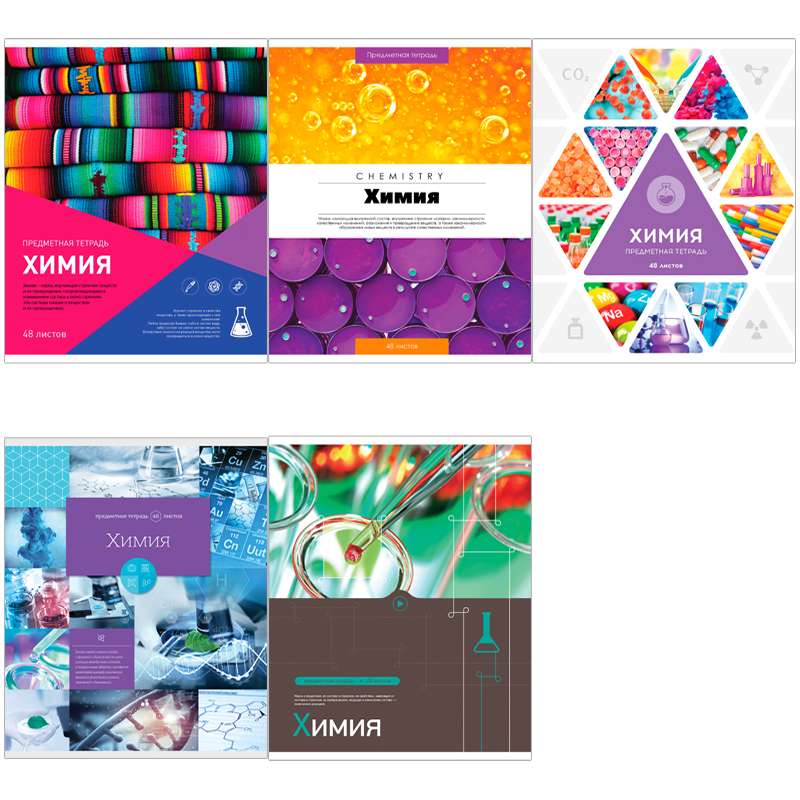 Тетрадь тематическая по химии из серии «Микс 5 в 1» (в серии 14 предметов), со справочным материалом на отдельных листах. Формат А5. Вид крепления – скрепка. Внутренний блок – 48 листов, офсет 60 г/м², белизна 100%, линовка – клетка с полями. Обложка – мелованный картон, отделка обложки – ВД-лак. 5 различных дизайнов по каждому предмету.Тетрадь тематическая 48л. "Микс 5 в 1" - Химия, 5 дизайнов