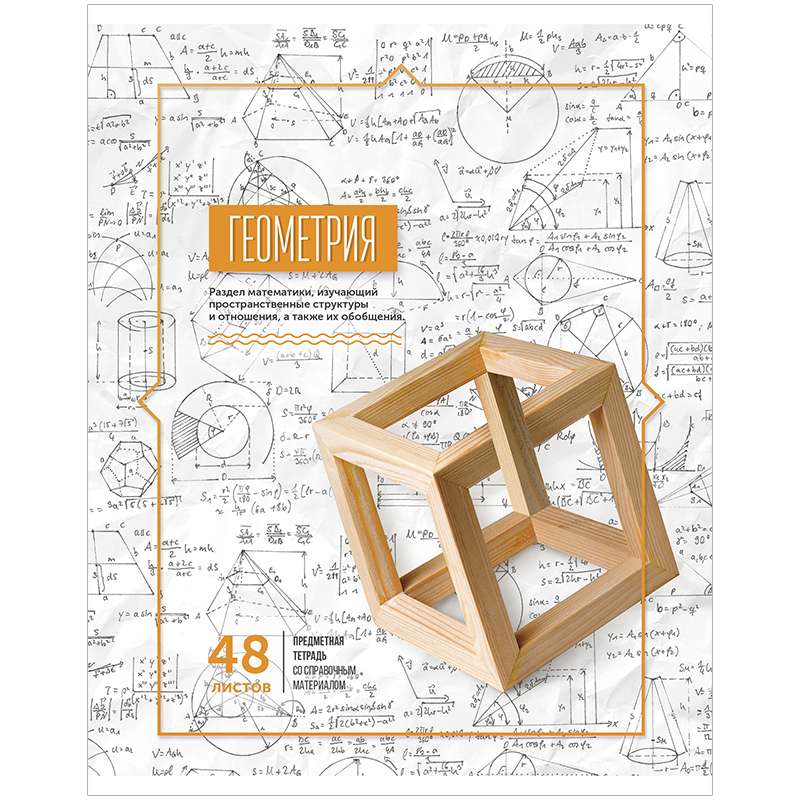 Тетрадь тематическая по геометрии из серии «Мир открытий» (в серии 14 предметов), со справочным материалом на отдельных листах. Формат А5. Вид крепления – скрепка. Внутренний блок – 48 листов, офсетный 60 г/м², белизна 100%, линовка – клетка с полями. Обложка – мелованный картон, отделка обложки – ВД-лак.Тетрадь тематическая 48л. "Мир открытий" - Геометрия