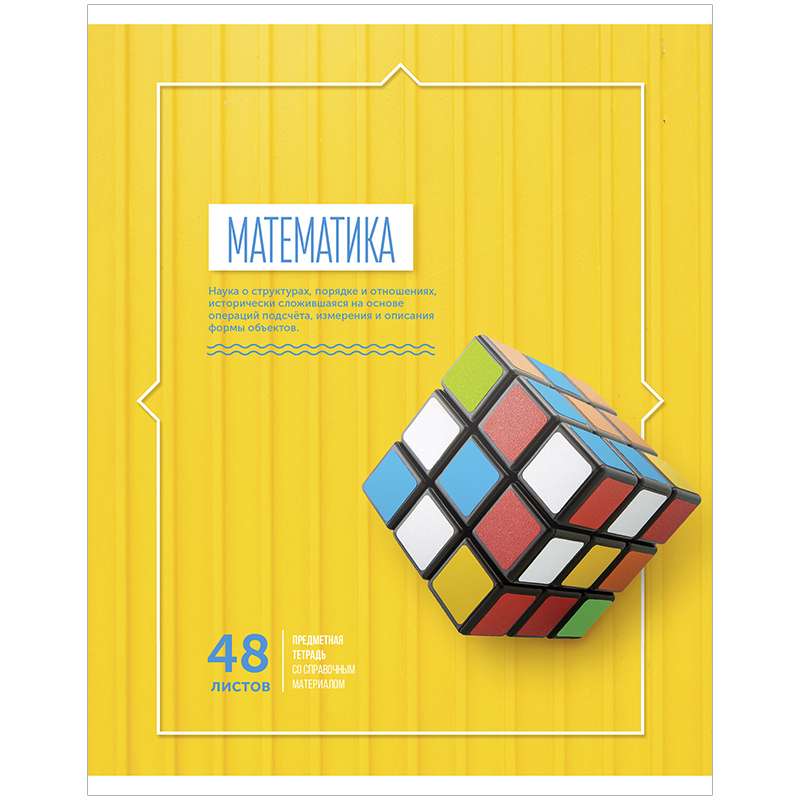 Тетрадь тематическая по математике из серии «Мир открытий» (в серии 14 предметов), со справочным материалом на отдельных листах. Формат А5. Вид крепления – скрепка. Внутренний блок – 48 листов, офсетный 60 г/м², белизна 100%, линовка – клетка с полями. Обложка – мелованный картон, отделка обложки – ВД-лак.Тетрадь тематическая 48л. "Мир открытий" - Математика