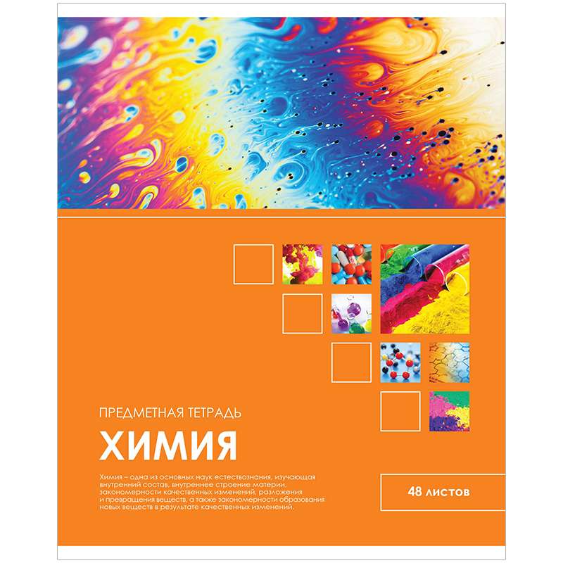 Тетрадь тематическая по химии из серии «Учись ярко!» (в серии 14 предметов), со справочным материалом на отдельных листах. Формат А5. Вид крепления – скрепка. Внутренний блок – 48 листов, офсет 60 г/м², белизна 100%, линовка – клетка с полями. Обложка – мелованный картон, отделка обложки – ТВИН-лак.Тетрадь тематическая 48л. "Учись ярко!" - Химия, ТВИН-лак