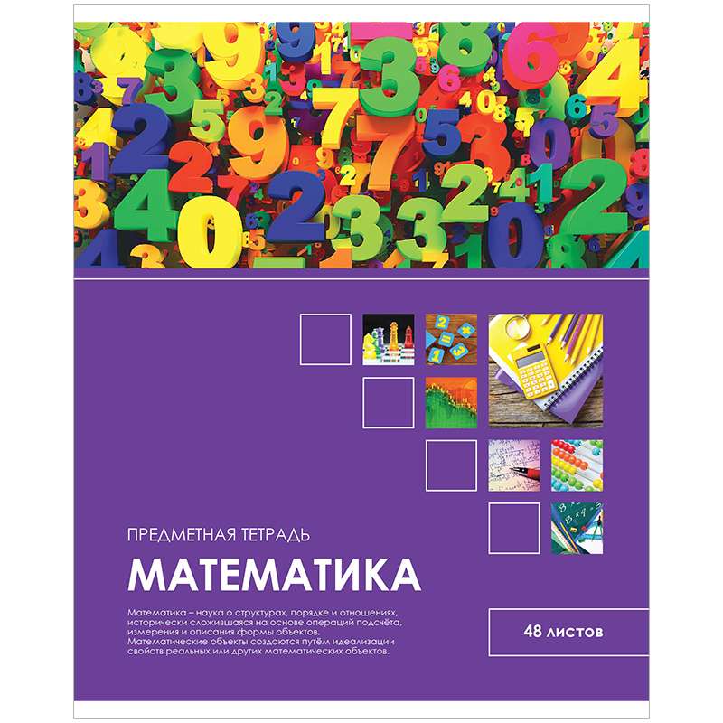 Тетрадь тематическая по математике из серии «Учись ярко!» (в серии 14 предметов), со справочным материалом на отдельных листах. Формат А5. Вид крепления – скрепка. Внутренний блок – 48 листов, офсет 60 г/м², белизна 100%, линовка – клетка с полями. Обложка – мелованный картон, отделка обложки – ТВИН-лак.Тетрадь тематическая 48л. "Учись ярко!" - Математика, ТВИН-лак