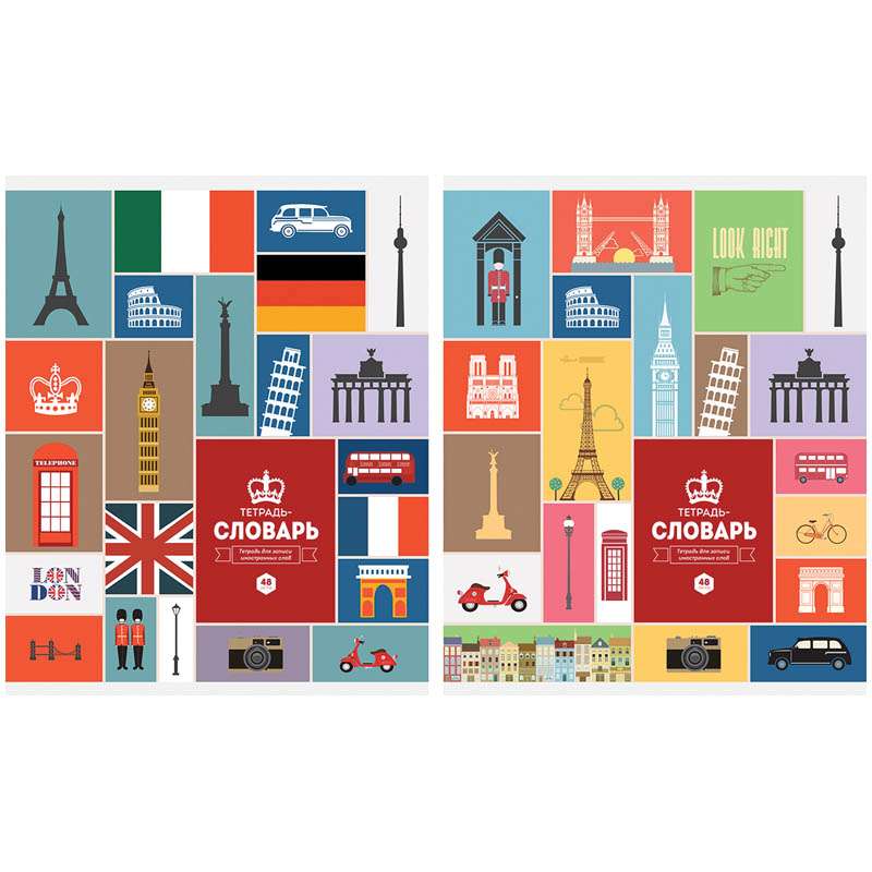 Тетрадь для записи иностранных слов. Внутренний блок - офсет 60 г/м2. Линовка: линия в 3 колонки: "Слово", "Транскрипция", "Перевод". Обложка - мелованный целлюлозный картон.Тетрадь-словарик 48л. А5 для записи иностранных слов "Страны"