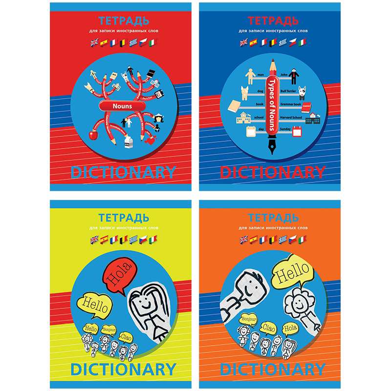 Формат А5. Вид крепления -гребень. Внутренний блок -офсетный, 60 г/м2. Обложка -мелованный картон.Тетрадь-словарик 80л. А5 для записи иностранных слов на гребне "Hello!"