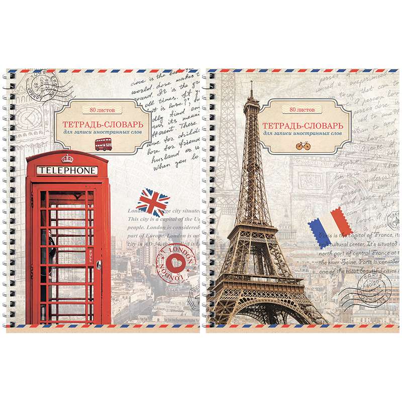 Тетрадь А5 (150*205 мм) для записи иностранных слов 80 листов на двойной евроспирали, с индексным алфавитным указателем (английский алфавит, 24 раздела).Тетрадь-словарик 80л. А5 для записи иностранных слов на гребне "Винтаж", с английской вырубкой