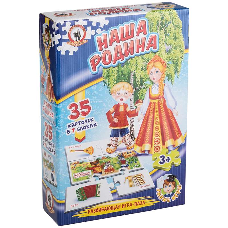 Игра «Наша Родина» познакомит ребёнка с государственными символами России, достопримечательностями Московского Кремля, культурой русского народа. Ребёнок узнает, насколько многонациональна наша страна и как она огромна. Он научится обобщать картинки и распределять их по группам. Правила игры просты, увлекательны и содержат несколько вариантов игр разного уровня сложности, направленных на развитие памяти, внимания и речи ребёнка.Игра настольная Русский стиль "Умные игры. Наша Родина", картонная коробка