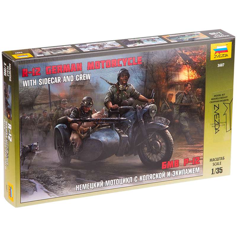 Немецкий мотоцикл концерна БМВ –Р12 –производился с 1935 по 1942 год. За этот период построили более 36000 БМВ Р-12 в военном и гражданском вариантах. Спортивный вариант Р-12 установил рекорд скорости в 279,5 км/ч, который продержался целых 14 лет! Благодаря высокой надежности при значительно более низкой, по сравнению со специальными армейскими мотоциклами BMW R-75 и KS-750 цене, BMW R-12 стал самым массовым мотоциклом в немецкой армии. На Р-12 доставляли боеприпасы и горячую пищу, эвакуировали в тыл раненых, доставляли донесения, отправлялись в разведку: трудно перечислить все армейские специальности этой машины. Кроме того, БМВ Р-12массово использовали в качестве боевого средства в специальных мотоциклетных подразделениях, где на коляску устанавливали пулемет.Модель для сборки Звезда "Немецкий мотоцикл с коляской и экипажем БМВ Р-12", масштаб 1:35